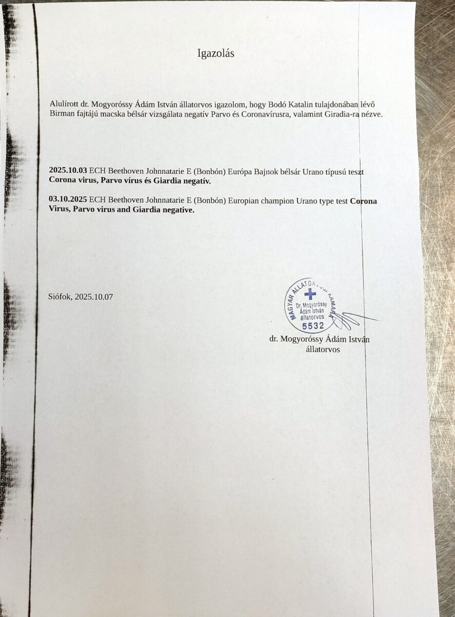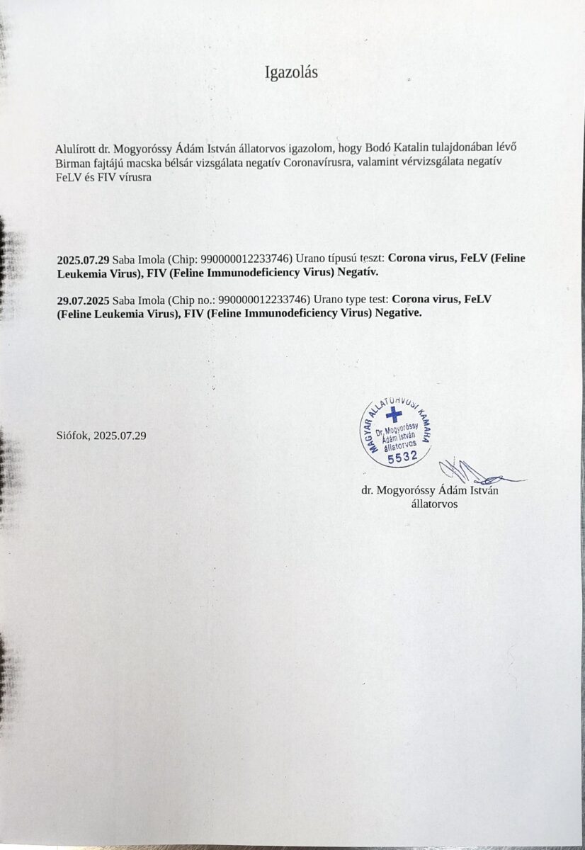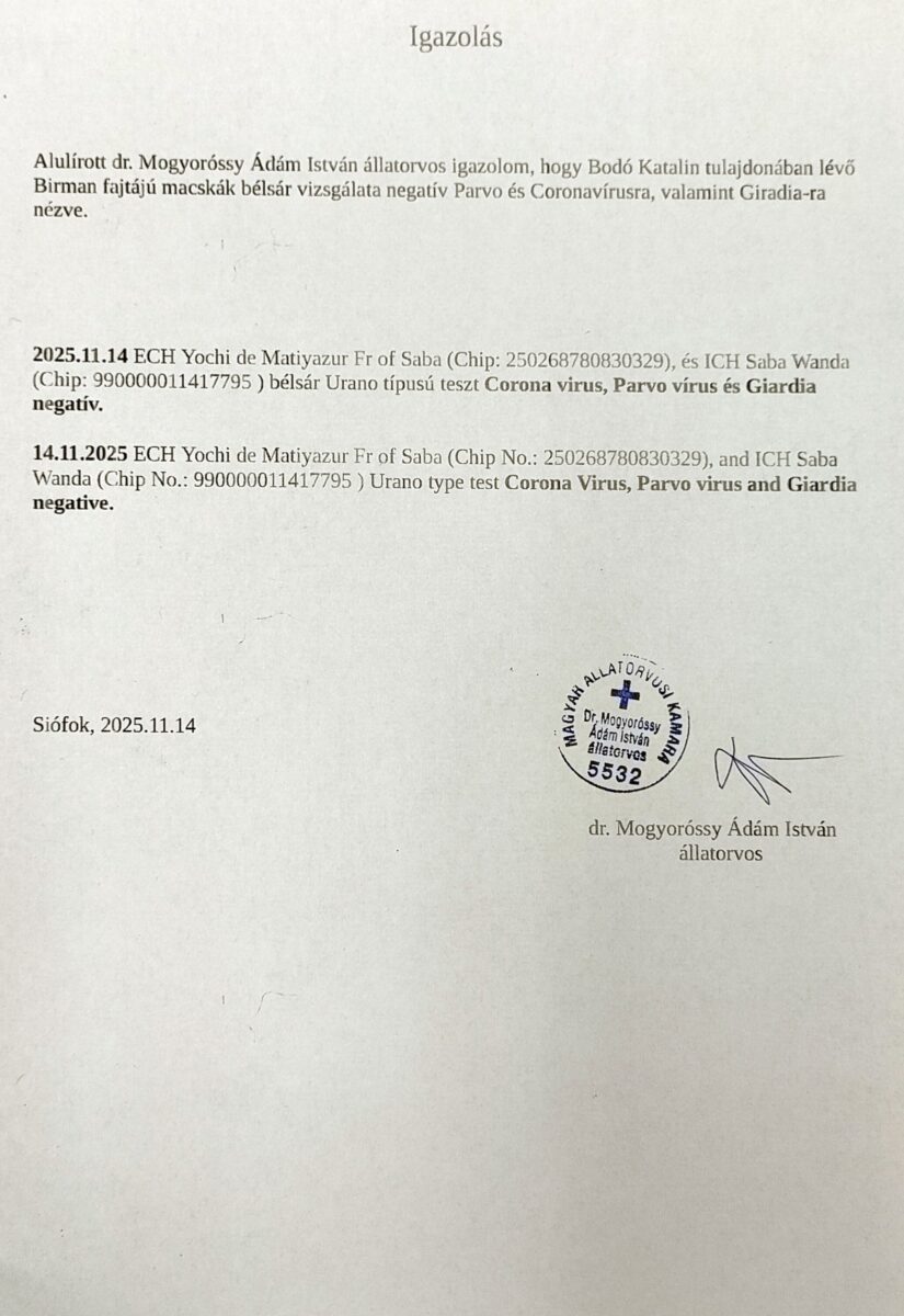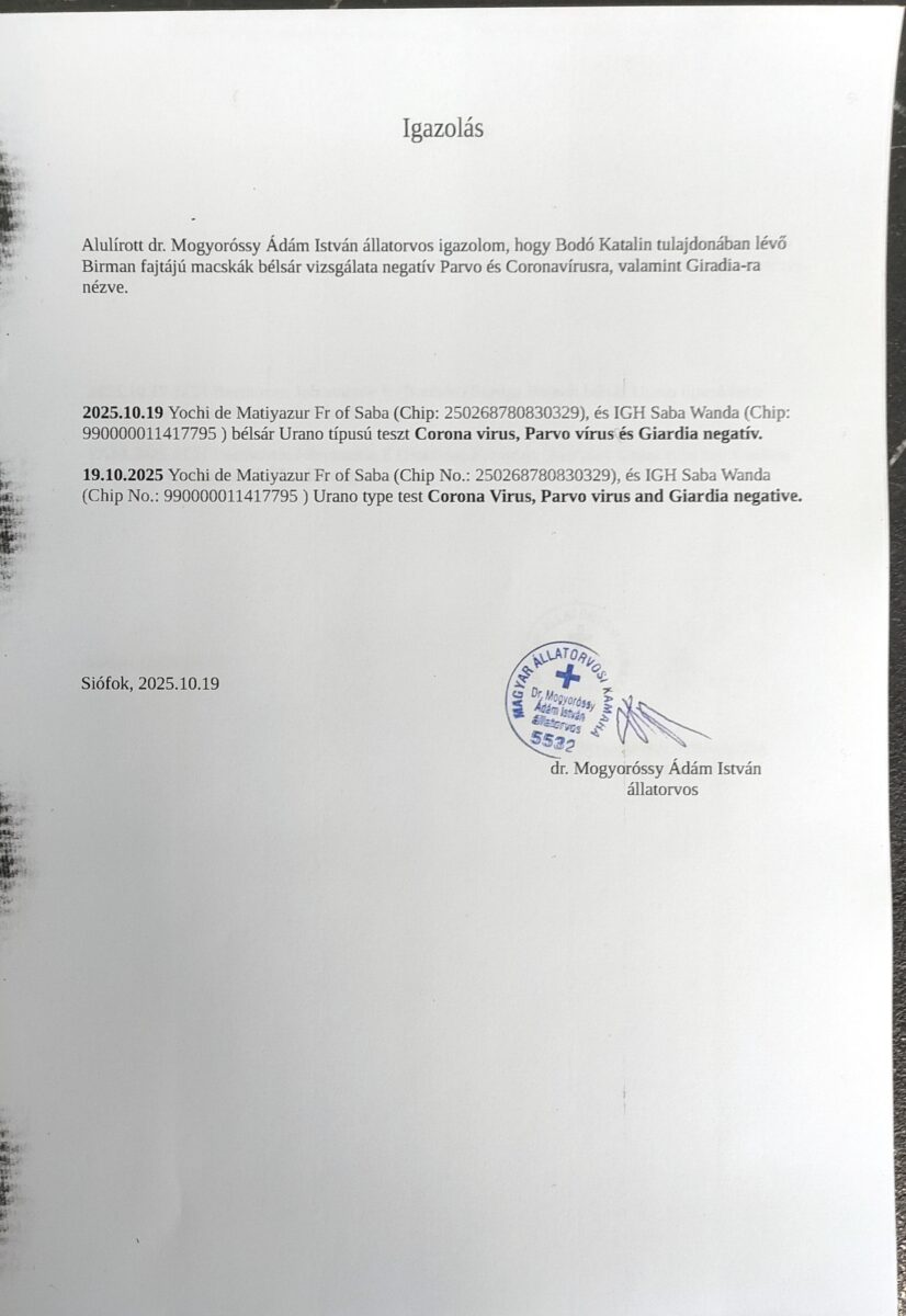 2025.07.06. Saba Natlan Corona, Giardia, Parvo, FIV, FeLV Negativ